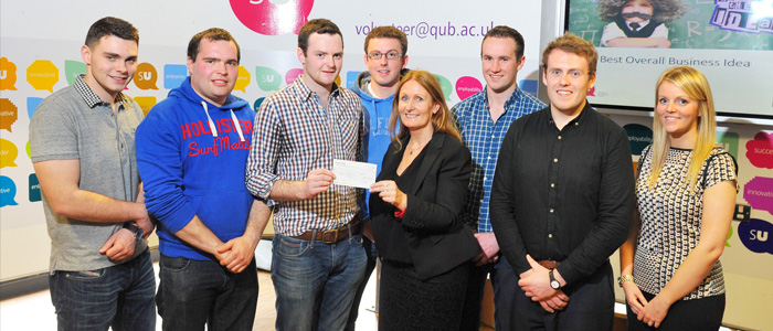 Image Caption: Colum Mackle from Co. Armagh, Owen Carragher from Co. Armagh, Paul McElroy from Co. Tyrone, Richard Gibson from Co. Tyrone, and Richard Primrose from Co. Tyrone with Patricia McNeill and Phil Murray of Ormeau Business Park and Judith Maguire of Queen’s Students’ Union’s Enterprise SU.