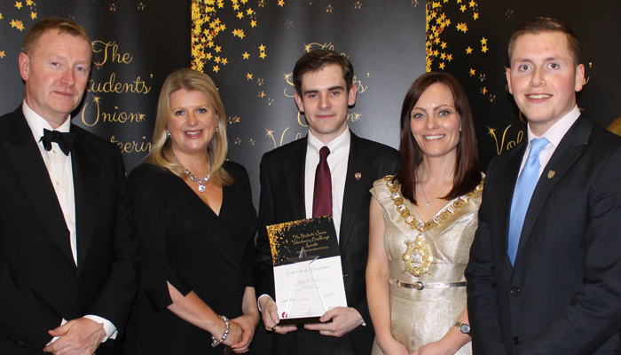 Seamus Reid of Reid Black Solicitors, Lisa Evans of Clements, Fergal McFerran winner of the Special Contribution Award, Nichola Mallon Lord Mayor of Belfast, and Niall McShane President of Queen’s Students’ Union.